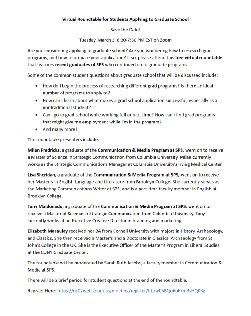 I hope everyone is having a great start to the semester. Today we would love to bring to your attention a save the date for a Virtual Roundtable for Students Applying to Graduate School event. Anyone is more than welcome to attend, especially those considering grad school. If you are interested, please register with this link, check out the attached flyer, and mark your calendars for Tuesday, March 3rd, from 6:30 – 7:30 P.M. Eastern. The event will take place over Zoom; students must register to receive a passcode for this virtual session. More details to come, so stay tuned!