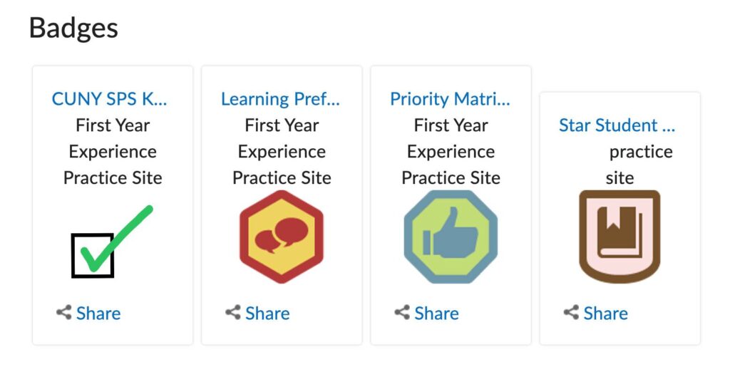 A badge in Brightspace is a small digital marker of achievement that students earn as they progress through your course.