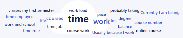 As you can see from the word cloud image, time (or more often the lack thereof) is the main reason participants prefer to study at their own pace rather than at a pace forced upon them. This leads to a whole other stream of issues such as financial aid requirements, seven-week semesters, and the like. For example, did you know that you cannot make the dean’s list unless you are enrolled in a minimum of twelve credits per term?